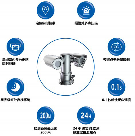 ·该产品适用于各种类型的燃气站场,对站场的各种设施进行24小时不间断扫描监测,加大战场的安全监控力度,提高安全管理高度。系统具备高稳定性、高可靠性、高使用寿命,满足少人站场或无人站场的天然气输送管道站场发展趋势,也从根本上杜绝站场的安全隐患,达到监控新厂气体泄漏的目的。
